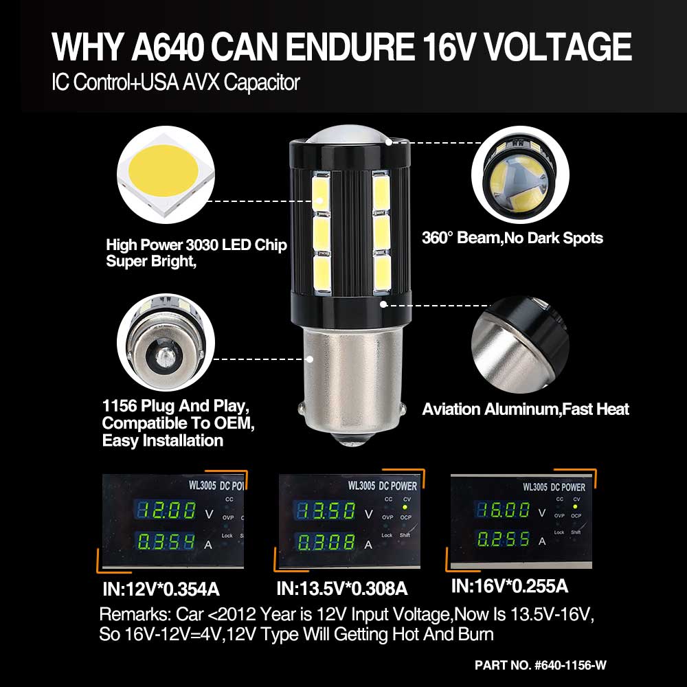 These new 600+Lm blanket of light for the driver to increase safety and nighttime visibility. We choose 5630 chips allow for the increased Lumen output while still drawing less than half the power of the factory halogen bulb. These 5630 chips can endure 105 degree heat testing, also have excellent heat dissipation characteristics, making them extremely reliable even in harsh environments.