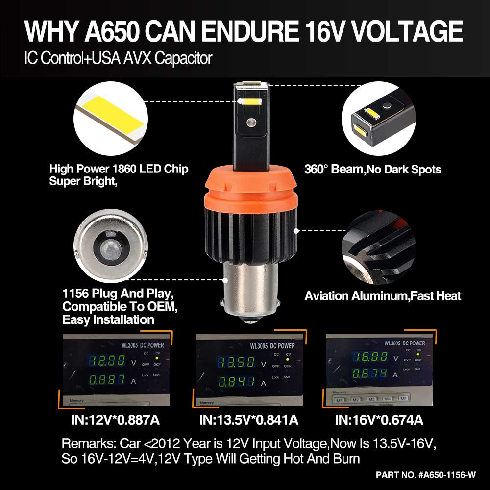 These new 600+Lm blanket of light for the driver to increase safety and nighttime visibility. We choose 1860 chips allow for the increased Lumen output while still drawing less than half the power of the factory halogen bulb. These 1860 chips can endure 105 degree heat testing, also have excellent heat dissipation characteristics, making them extremely reliable even in harsh environments.