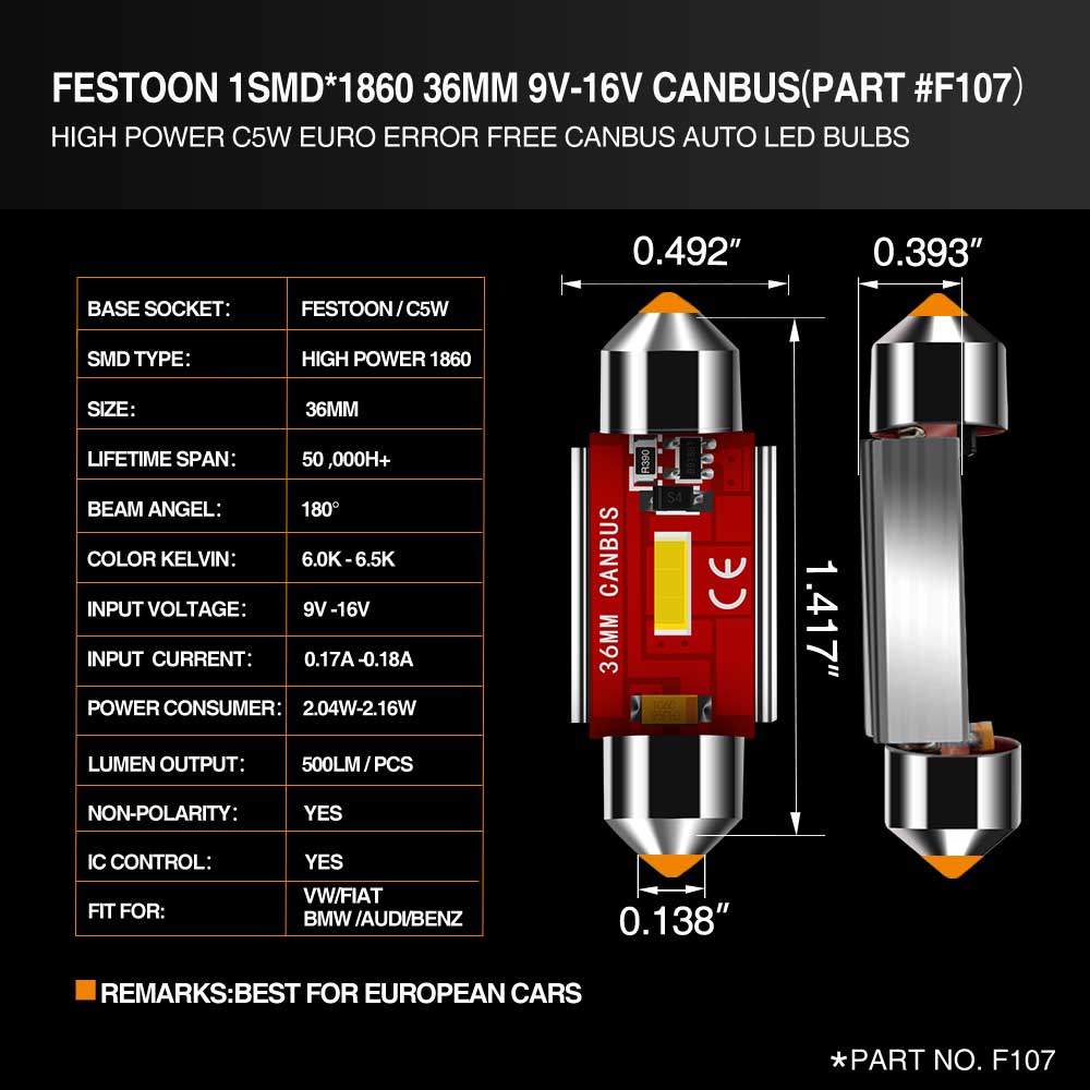 F107:C5W,Festoon High Power 1860 36mm 12V C5W Festoon White Euro Error Free Canbus LED Bulbs For Dashboards,indication solve Canbus errror codes