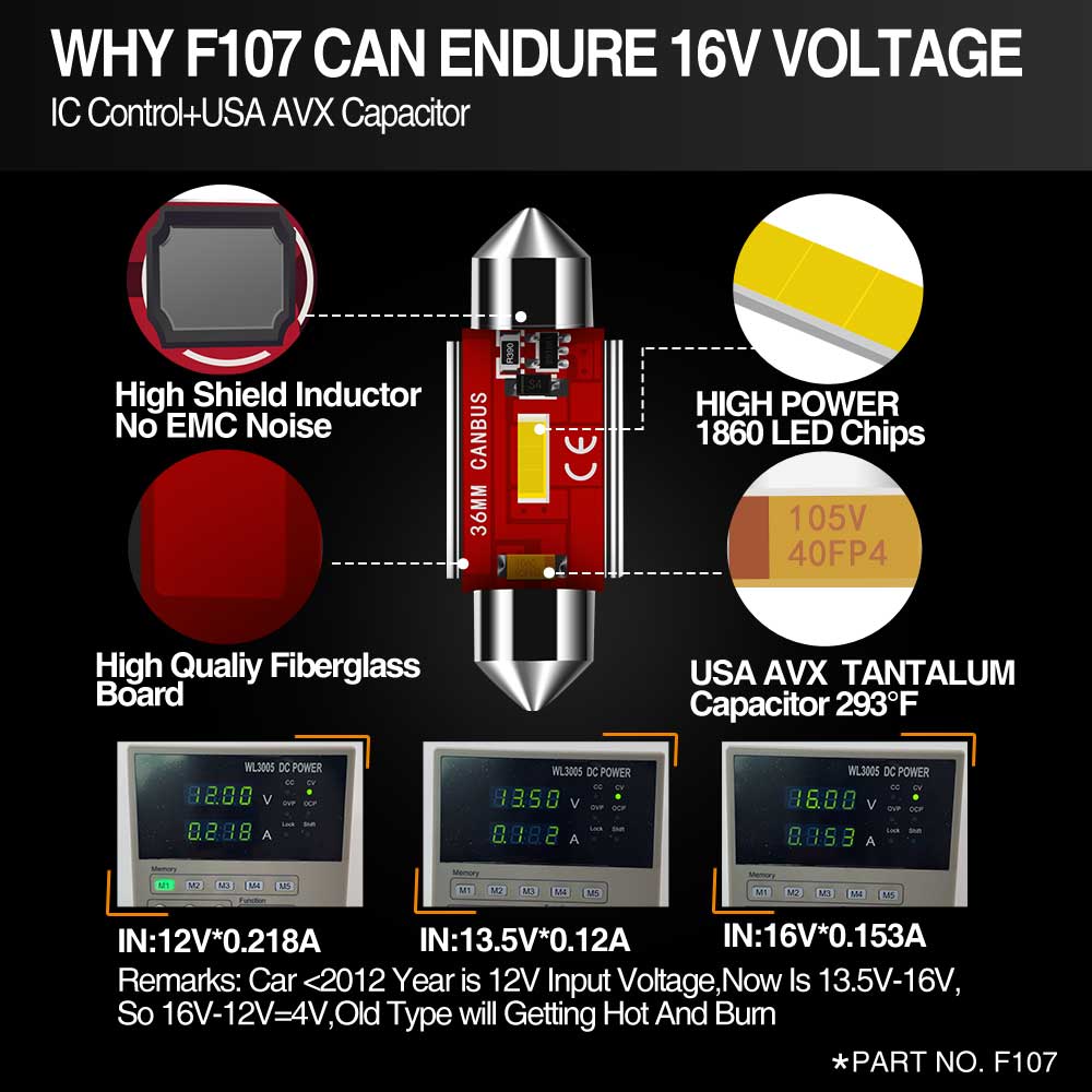 These new 300+Lm blanket of light for the driver to increase safety and nighttime visibility. We choose high power 1860 led chips allow for the increased Lumen output while still drawing less than half the power of the factory halogen bulb. These 1860 chips can endure 105 degree heat testing, also have excellent heat dissipation characteristics, making them extremely reliable even in harsh environments.