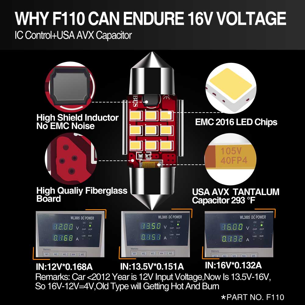These new 300+Lm blanket of light for the driver to increase safety and nighttime visibility. We choose 2016 EMC chips allow for the increased Lumen output while still drawing less than half the power of the factory halogen bulb. These 2016 chips can endure 105 degree heat testing, also have excellent heat dissipation characteristics, making them extremely reliable even in harsh environments.