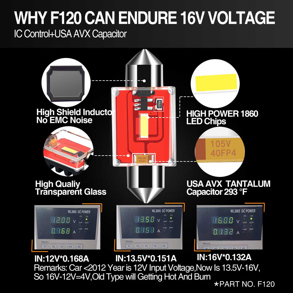 These new 300+Lm blanket of light for the driver to increase safety and nighttime visibility. We choose high power 1860 led chips allow for the increased Lumen output while still drawing less than half the power of the factory halogen bulb. These 1860 chips can endure 105 degree heat testing, also have excellent heat dissipation characteristics, making them extremely reliable even in harsh environments.