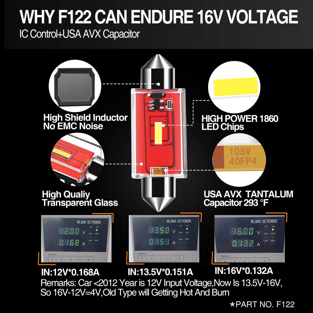 These new 300+Lm blanket of light for the driver to increase safety and nighttime visibility. We choose 2016 EMC chips allow for the increased Lumen output while still drawing less than half the power of the factory halogen bulb. These 2016 chips can endure 105 degree heat testing, also have excellent heat dissipation characteristics, making them extremely reliable even in harsh environments.